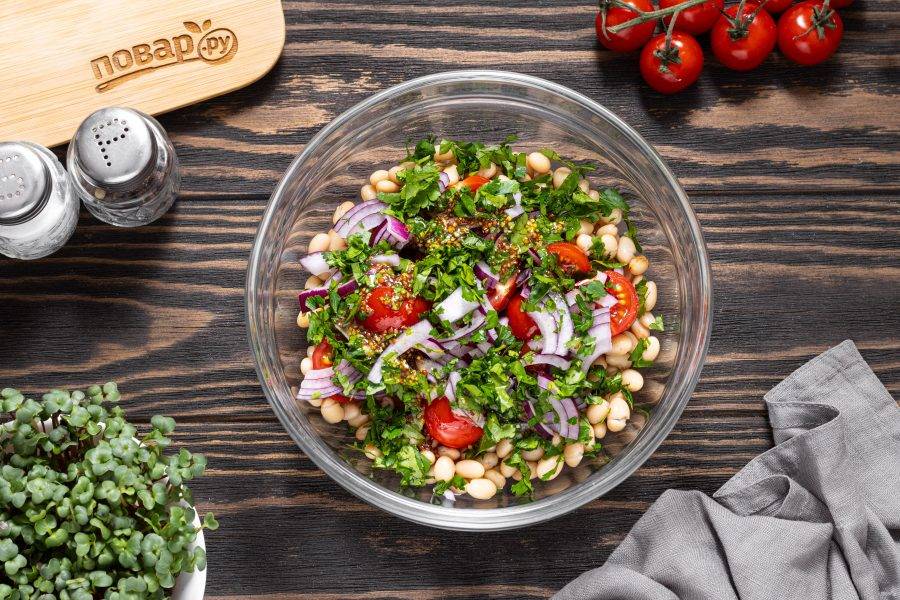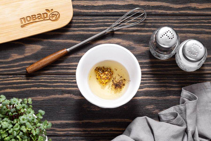 Для заправки смешайте оливковое масло с белым винным уксусом и зернистой горчицей. Добавьте соль и черный молотый перец по вкусу.