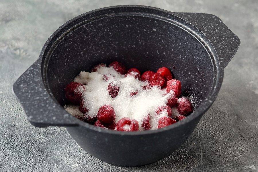 Замороженную вишню переложите в кастрюлю, добавьте сахар и воду. Поставьте на средний огонь.