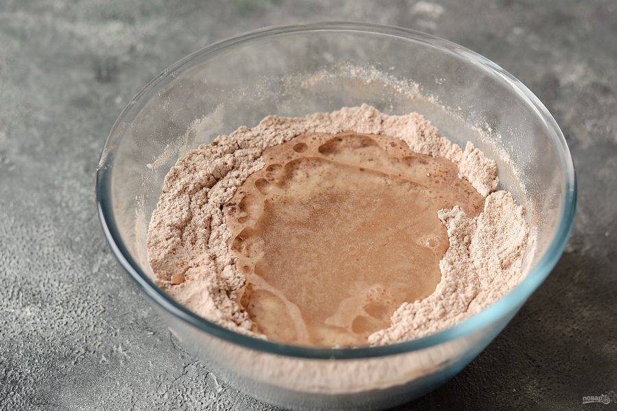 Для теста смешайте муку, сахар, какао-порошок, разрыхлитель, соду и соль.