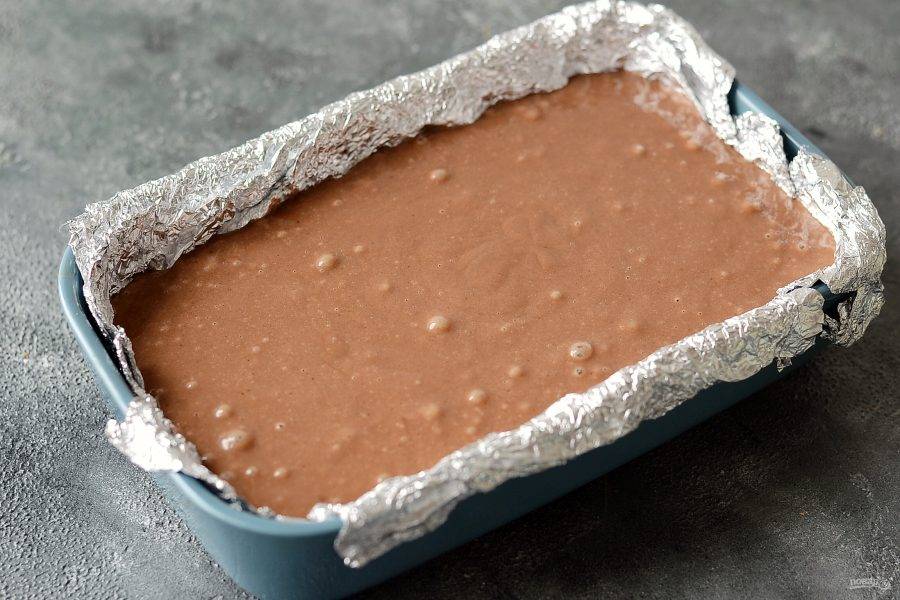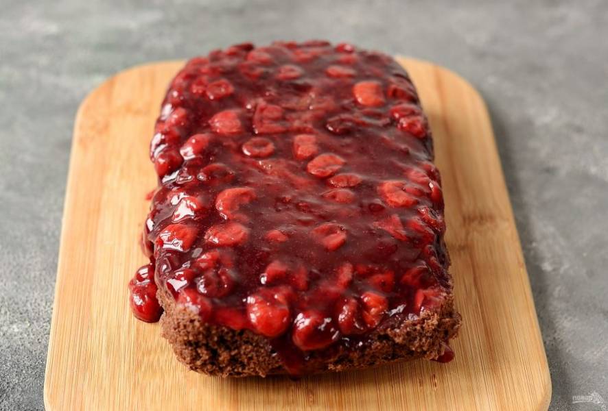 Застелите дно формы фольгой или бумагой для выпечки. На дно выложите вишневую начинку.
