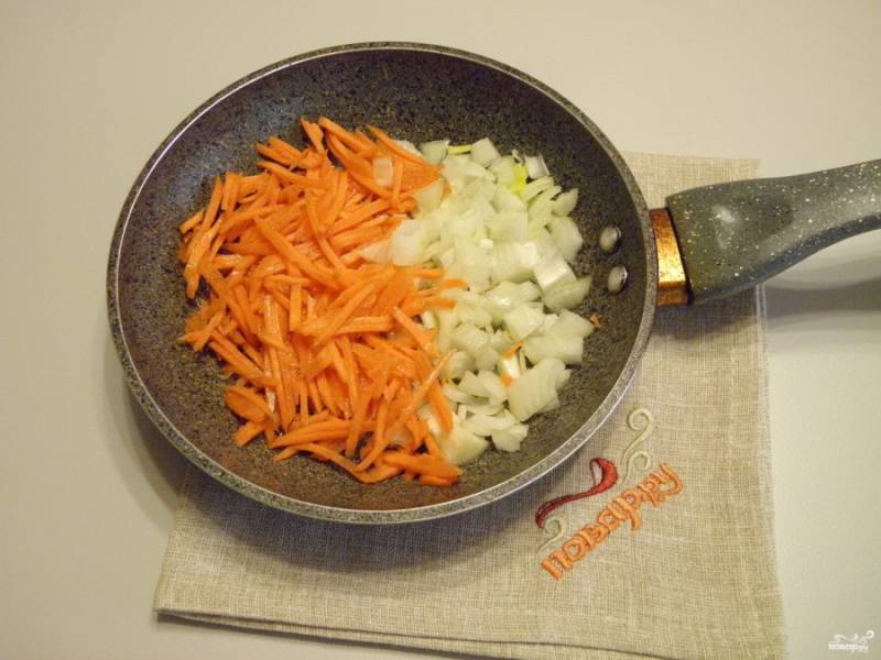 Лук и морковь измельчите и поставьте жарится на растительном масле до готовности.