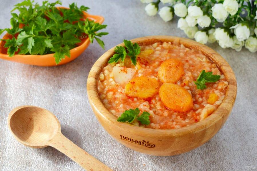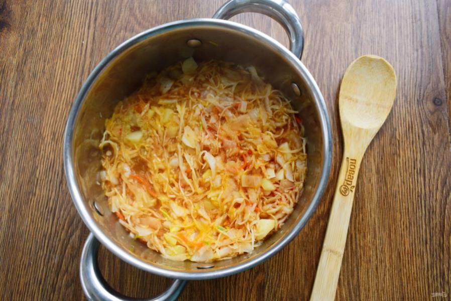 Добавьте капусту, булгур, картофель, нарезанный мелкими кубиками, измельченную курагу и томатный соус.