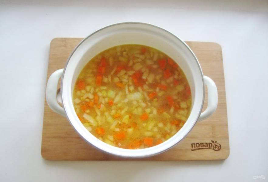 Когда фасоль будет почти готова, выложите в кастрюлю морковь и лук.