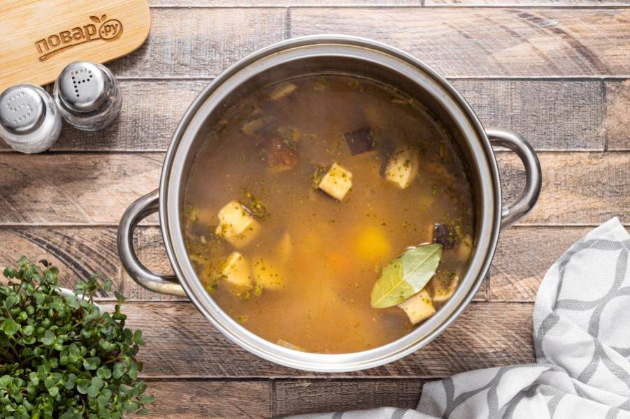Посолите по вкусу, добавьте и лавровый лист. Варите суп 20 минут после закипания на небольшом огне. После дайте ему еще постоять на плите 10-15 минут, затем суп можно подавать.