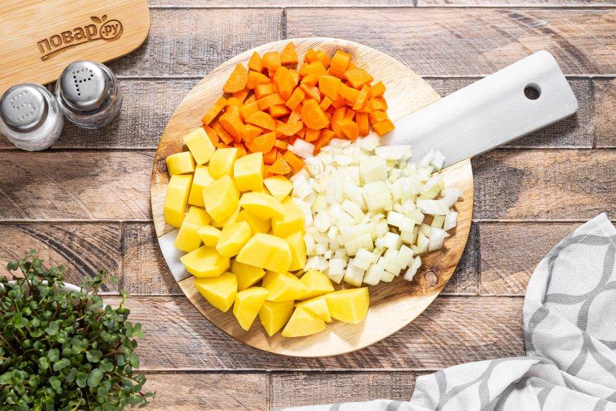 Морковь очистите, нарежьте на небольшие ломтики или брусочки. Картофель очистите и нарежьте на ломтики среднего размера. Репчатый лук нарежьте кубиками.