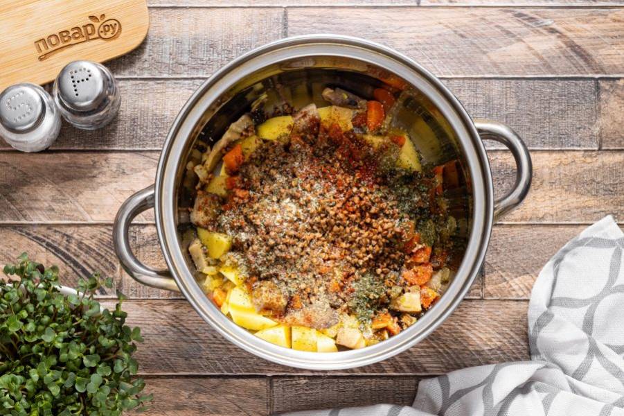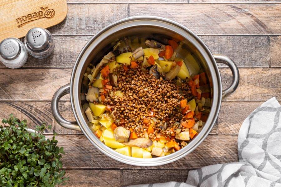 Добавьте промытую гречку.