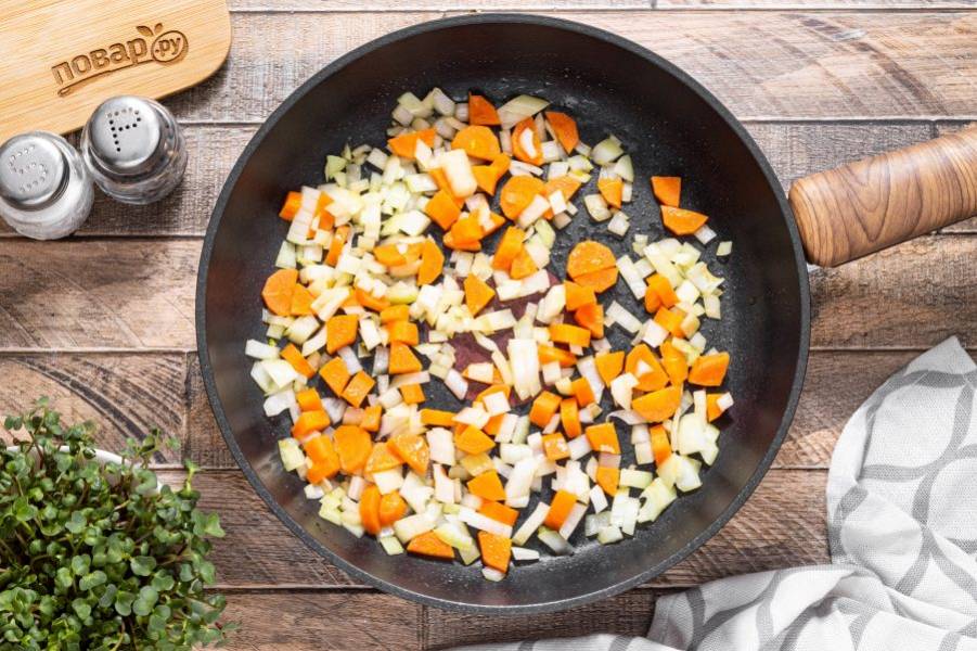 Разогрейте сковороду на среднем огне, обжарьте репчатый лук вместе с морковью до мягкости и румяного цвета.