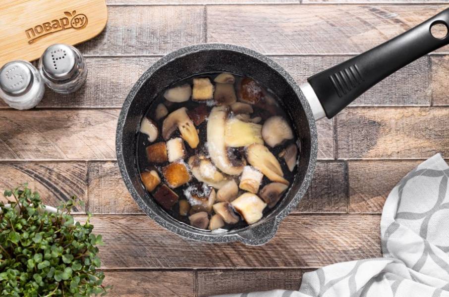 Замороженные грибы тщательно промойте после разморозки. Переложите в кастрюлю и отварите 15 минут, первый бульон слейте, а грибы откиньте на сито.