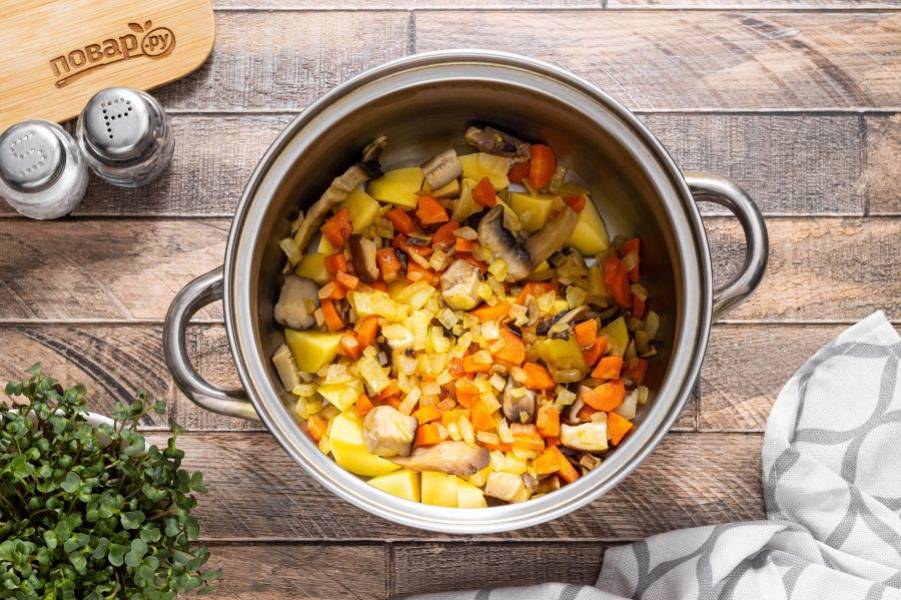 Добавьте зажарку из овощей и грибы.