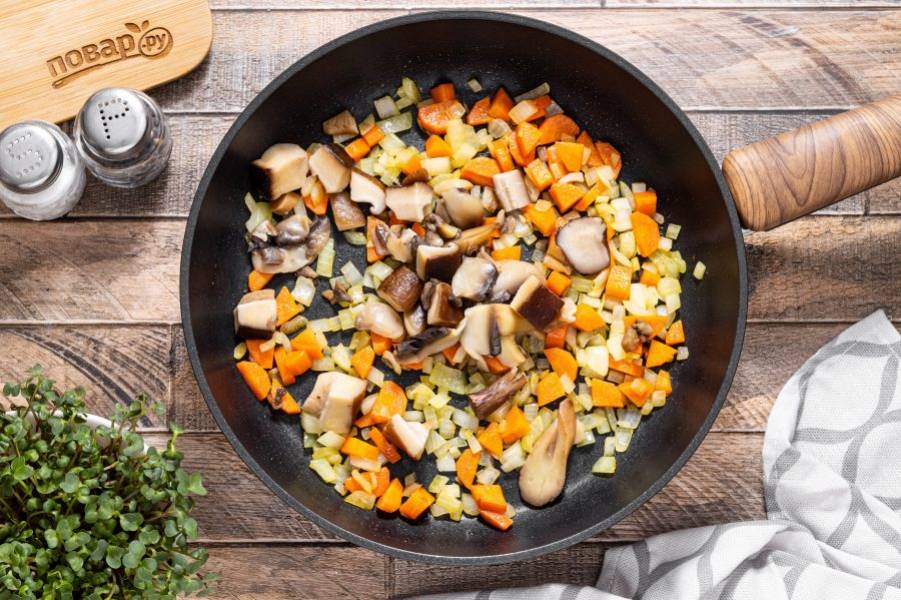 Добавьте грибы и жарьте еще 5-7 минут.