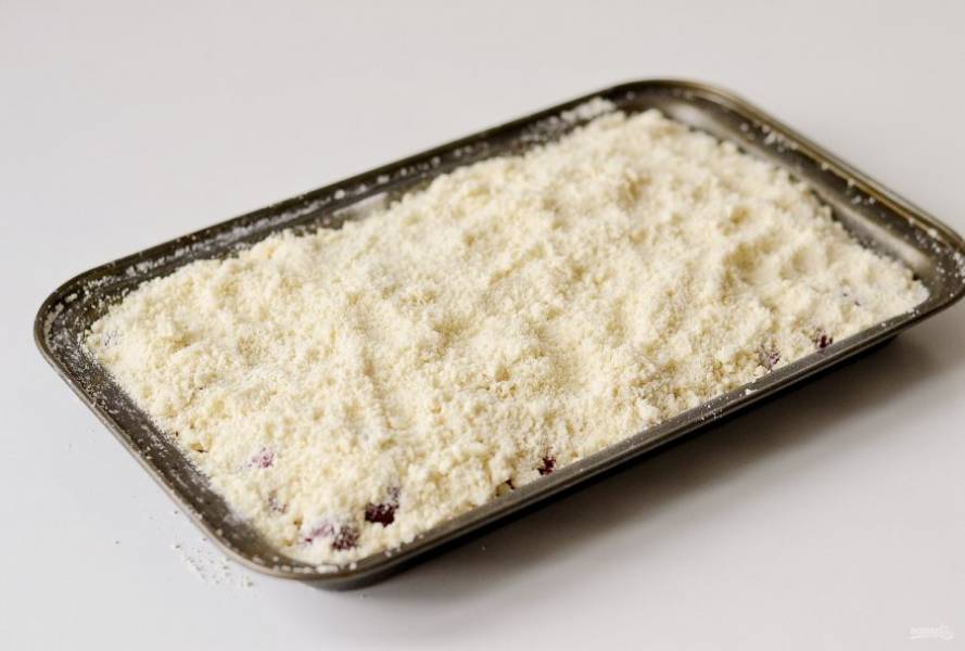 Сверху выложите оставшееся тесто крошкой. Выпекайте пирог при температуре 180 градусов в течение 30 минут.