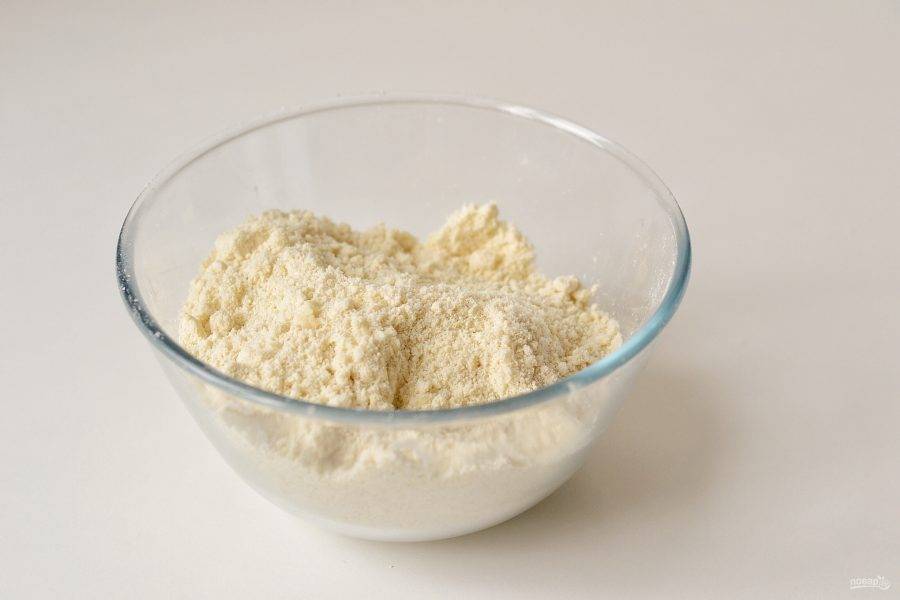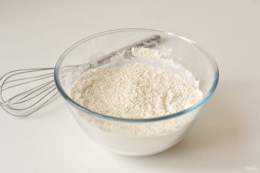 Просейте муку, разрыхлитель и сахар в миску. Перемешайте.