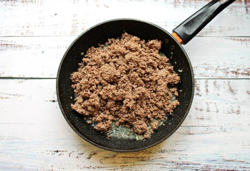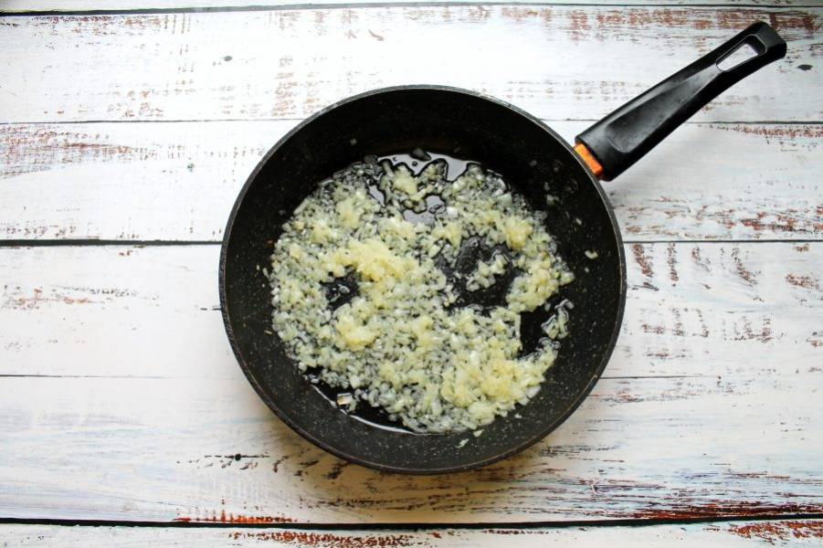 Репчатый лук почистите, мелко порежьте и обжарьте в растительном масле на среднем огне до мягкости. На это уйдет примерно 7-10 минут.