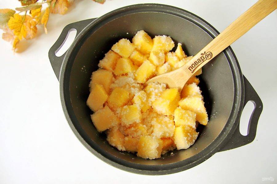 Тыкву очистите от мякоти и семечек. Снимите кожуру и промойте под проточной водой. Нарежьте мякоть небольшими кубиками и сложите в посуду с толстым дном.