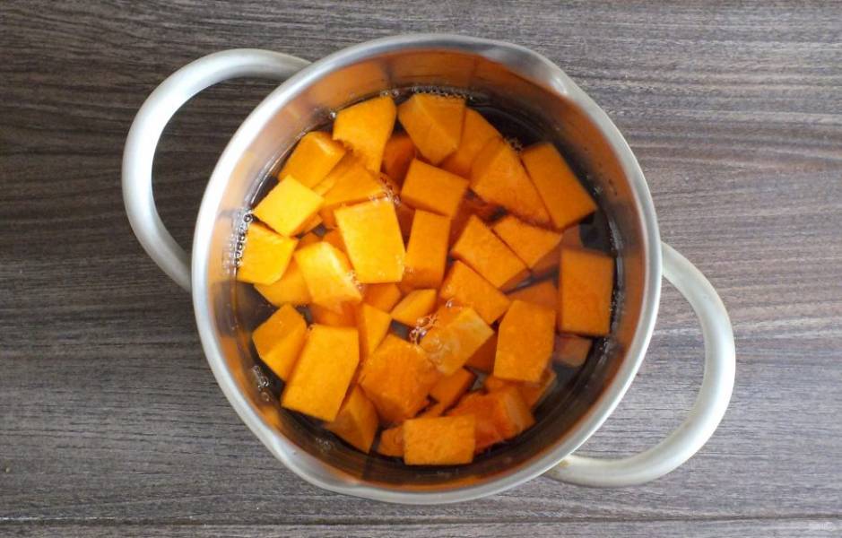 Очистите тыкву от кожуры, нарежьте средними кусочками. Залейте водой так, чтобы она слегка покрывала тыкву. Поставьте на умеренный огонь, варите до готовности тыквы.