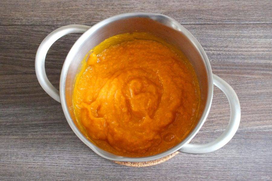 С кураги слейте воду, сухофрукты не отжимая переложите к тыкве.