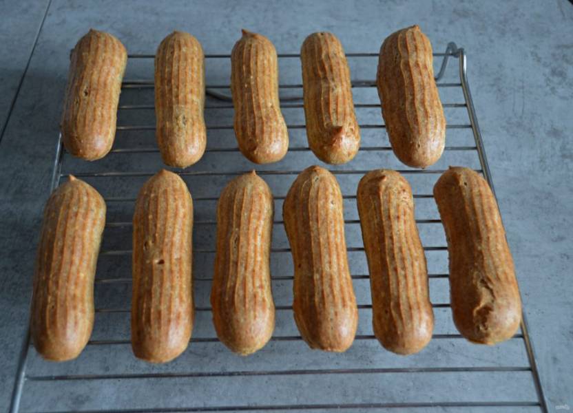 Через 30 минут отсадите эклеры на лист для выпечки. Разогрейте духовку в режиме "Верх-низ" до 200 градусов. Сразу, после того, как вы поместили противень в духовку, понизьте температуру до 180 градусов и выпекайте 10 минут, после этого понизьте температуру до 140 градусов и выпекайте еще около 55-60 минут.