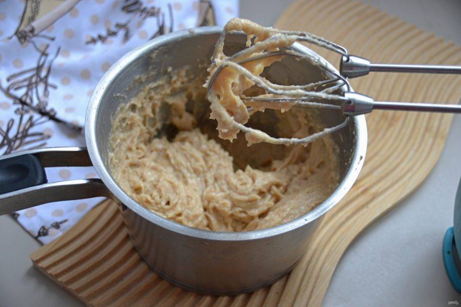 Если в тесте образовались небольшие комочки, как на фото выше, смените венчик на миксере на венчик для взбивания и пробейте до равномерного состояния.