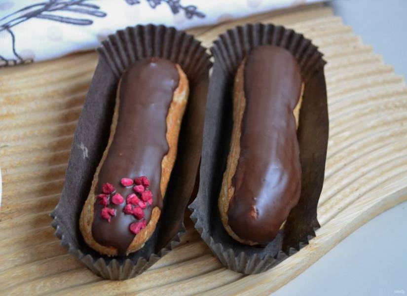 Заполненные начинкой эклеры уберите на время в холодильник, чтобы охладить перед нанесением шоколадной глазури.