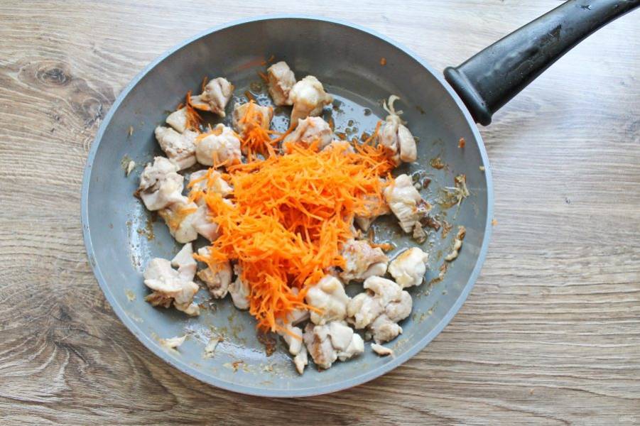 Морковь почистите, и вымойте, натрите на средней терке. Добавьте ее в сковороду с курицей.