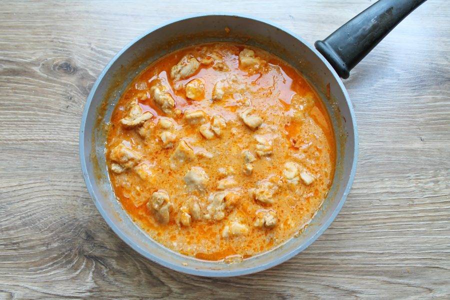Убавьте огонь и тушите все под крышкой в течение 10 минут. Снимите с огня и сразу подавайте блюдо к столу.
