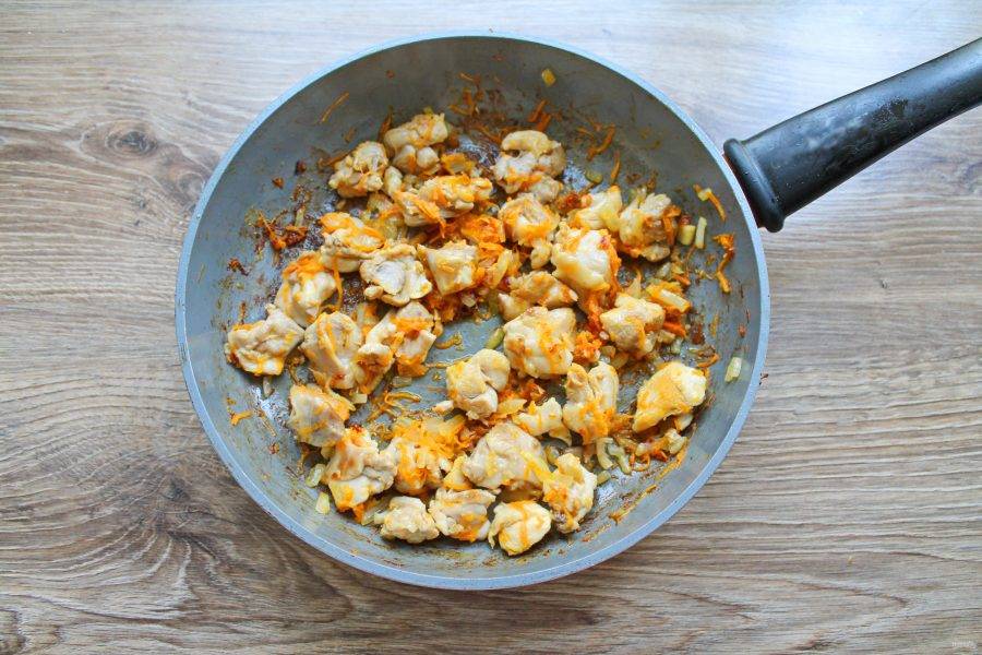 Почистите лук и мелко порежьте, добавьте в сковороду с курицей и морковью.