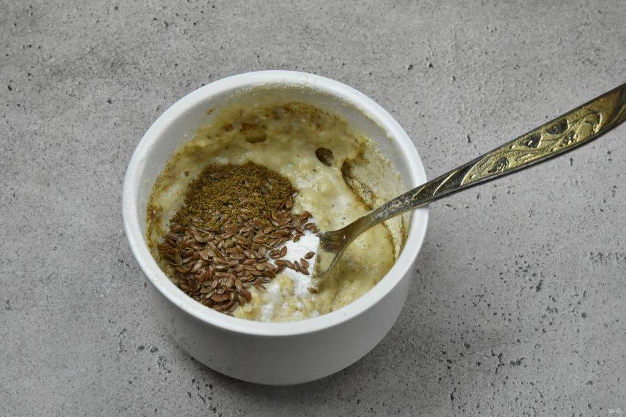 Добавьте семена льна и перемешайте смесь, чтобы ингредиенты распределились по всему объему. В тесто можно добавить любые семечки, специи, пряные травы, зелень.