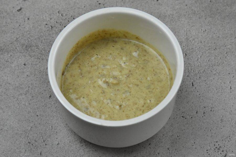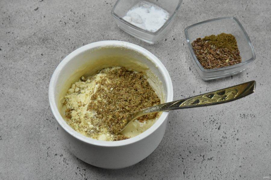 Всыпьте к остальным ингредиентам льняную муку, соль, разрыхлитель и молотый кориандр. Размешайте, чтобы сухие ингредиенты равномерно пропитались влагой.