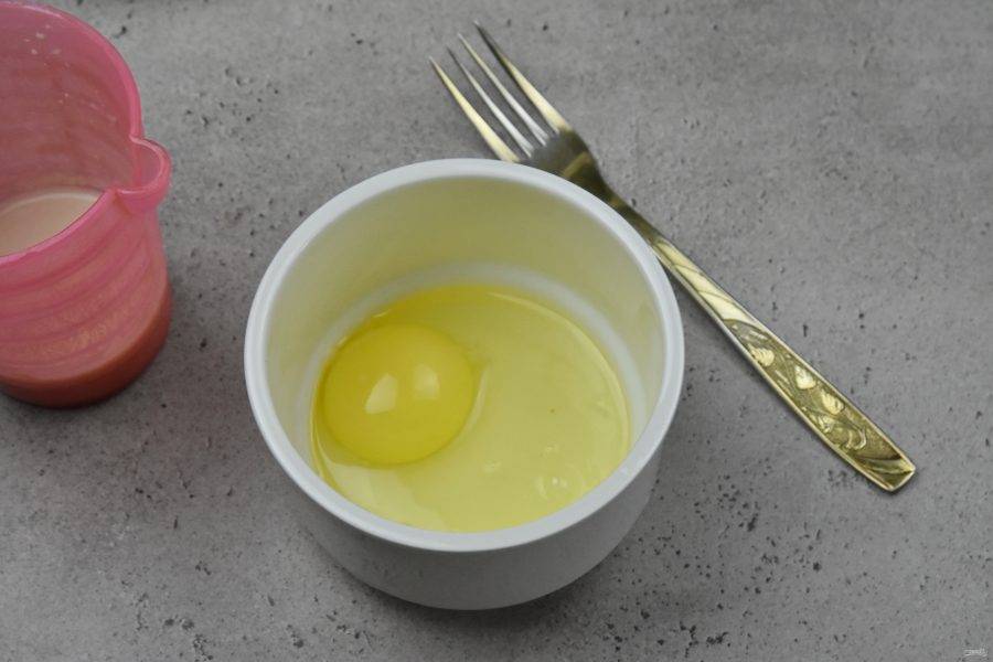 Вбейте в емкость яйцо и слегка размешайте его вилкой. Влейте теплый кефир и размешайте.