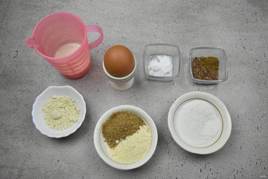 Подготовьте продукты для приготовления хлеба. Если у вас отсутствует какая-либо мука, можно заменить ее количество любой другой, не содержащей глютен, например гречневой, соевой, кокосовой или овсяной. Льняную муку можно получить смолов в кофемолке семена льна. Кефир слегка подогрейте в микроволновке в течение 30 секунд.