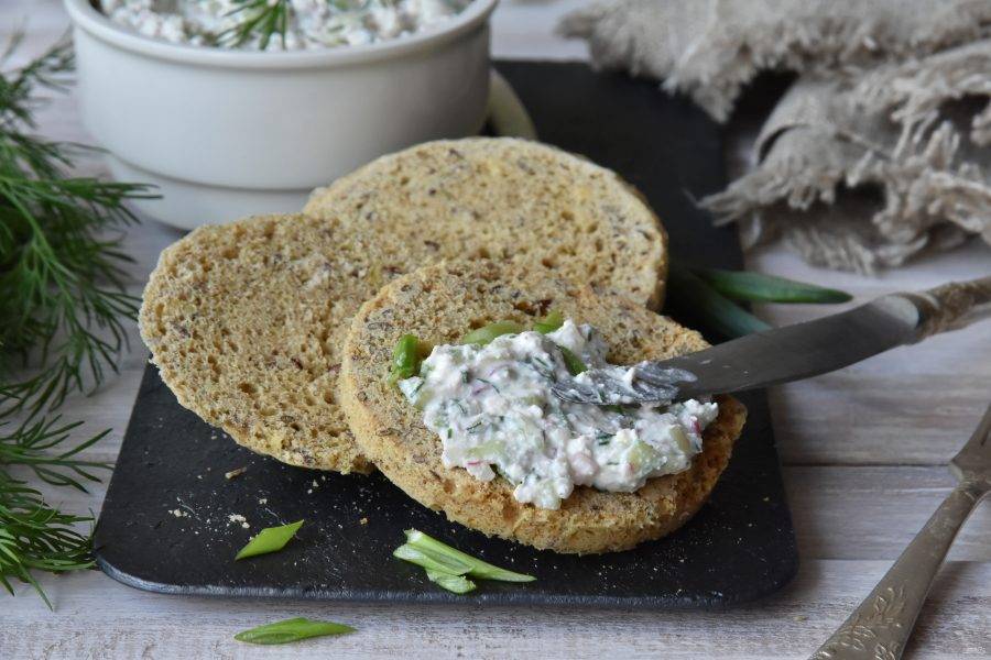 После выпечки хлеб готов к употреблению. Мякиш у хлеба пористый и достаточно сухой. Добавление специй и семечек делает вкус и текстуру хлеба приятной и интересной.