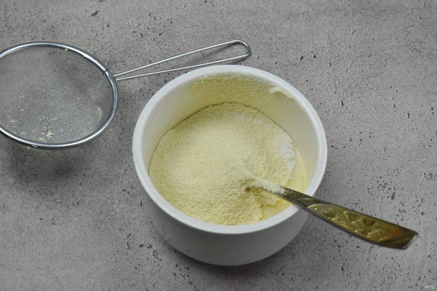 Соедините кукурузную, нутовую и рисовую муку. Просейте через сито в форму с яйцом.