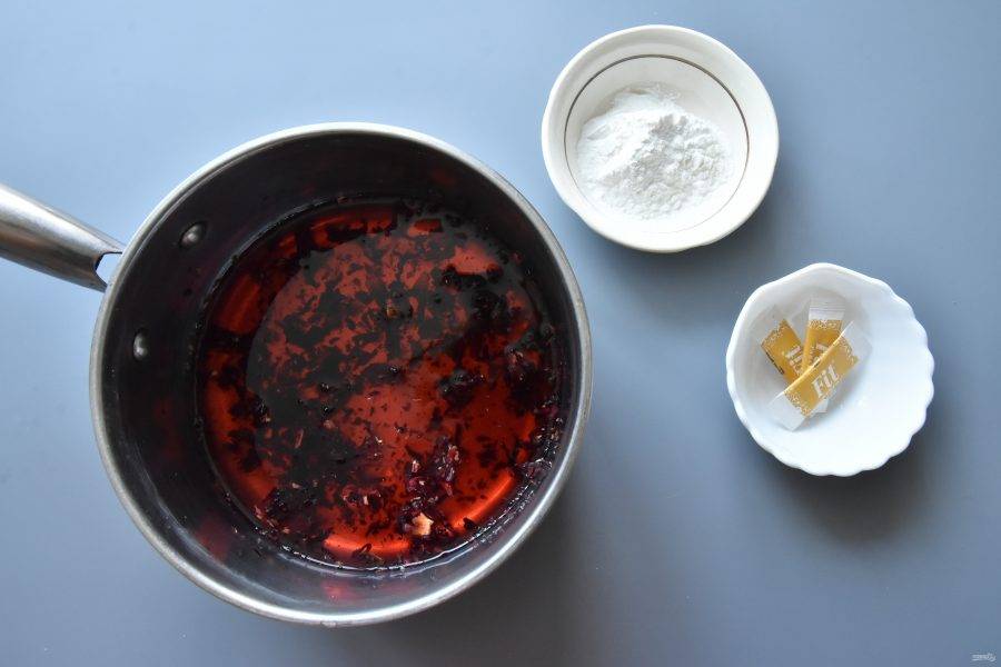 В сотейник влейте воду и добавьте горсть чая каркаде. Доведите жидкость до кипения. Добавьте сахарный заменитель.