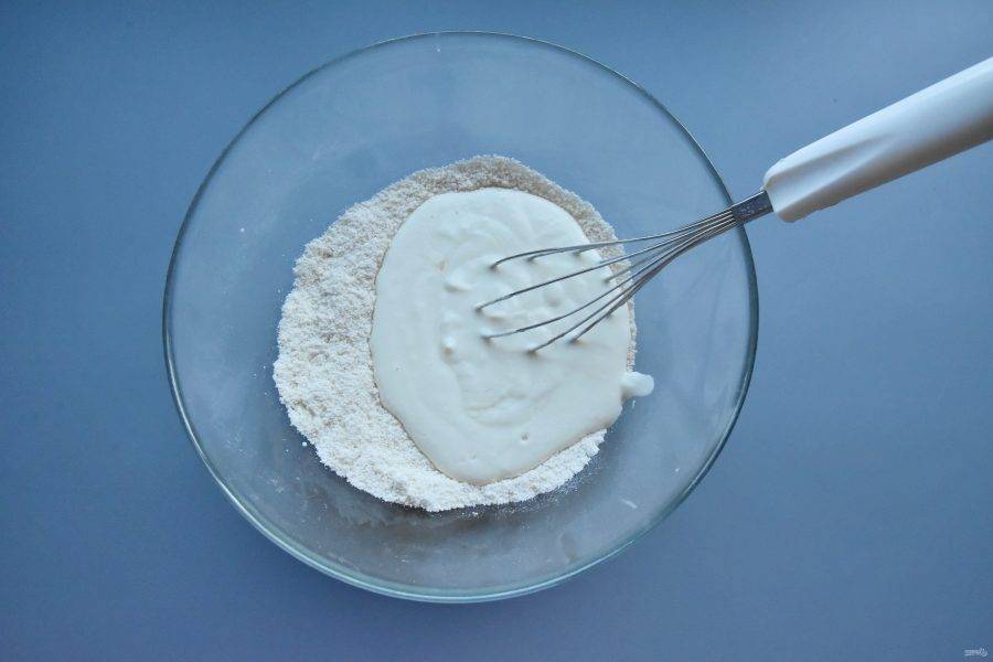 Смешайте венчиком ингредиенты для теста в однородную смесь.