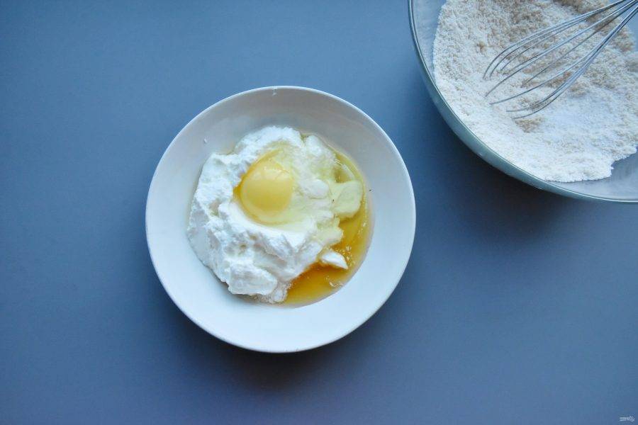 В отдельной емкости соедините мягкий творог, яйцо, сироп топинамбура. Растопите кокосовое масло в микроволновой печи в течение 30 секунд, остудите и добавьте к жидким составляющим теста. Размешайте смесь венчиком до объединения всех компонентов в однородную смесь.