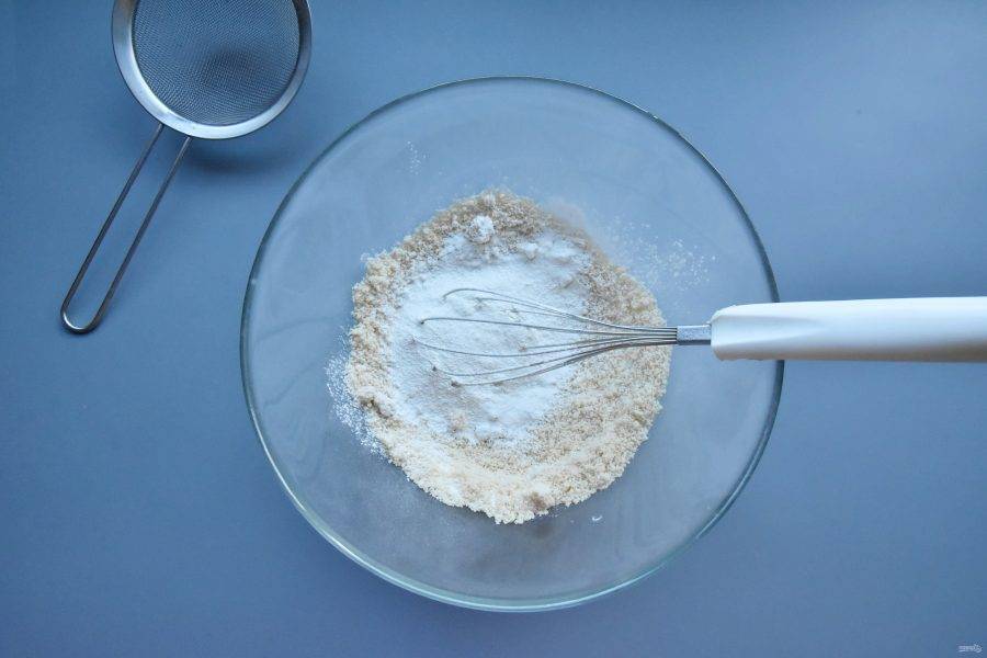 Рисовую муку соедините с содой, разрыхлителем и просейте через мелкое сито в миску. Добавьте миндальную муку, сахарозаменитель и размешайте смесь венчиком, чтобы компоненты равномерно распределились.