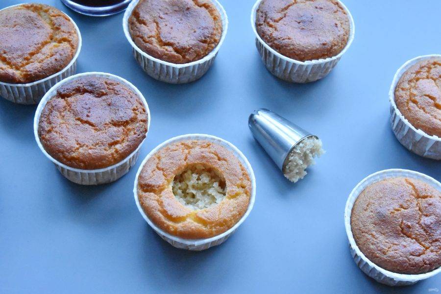 Извлеките серединки теста из капкейков для заполнения их начинкой. Если у вас нет специального устройства, можно воспользоваться насадкой от кондитерского мешка.