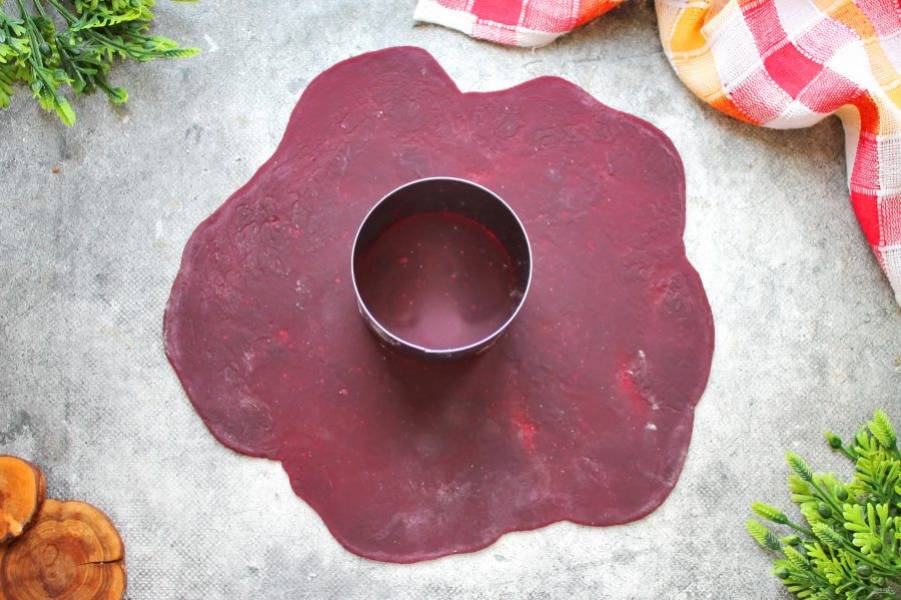 Посыпьте рабочую поверхность тонким слоем крахмала и раскатайте тесто в тонкий пласт. Тесто довольно упругое и нужно будет приложить немного усилий. При помощи вырубки диаметром 10 сантиметров круги по количеству замороженных начинок. Если сразу не получится сделать нужное количество, соедините обрезки и снова раскатайте.