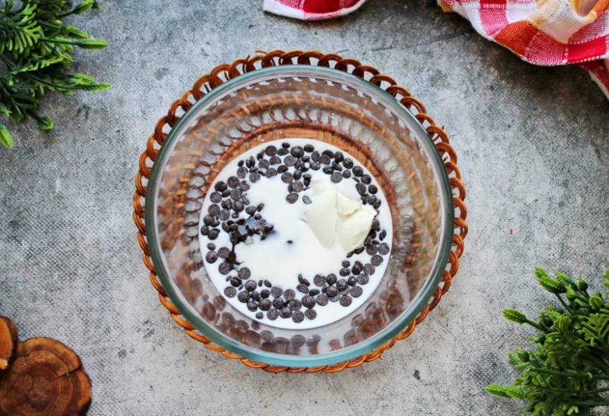 Поставьте все в микроволновку и растопите все до однородности в импульсном режиме по 10 минут при мощности 800 Ватт, перемешивая. Не включайте сразу большое время, есть опасность перегреть, тогда шоколад свернется.