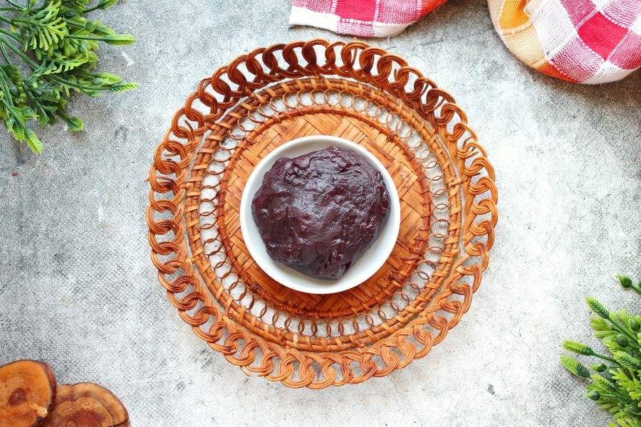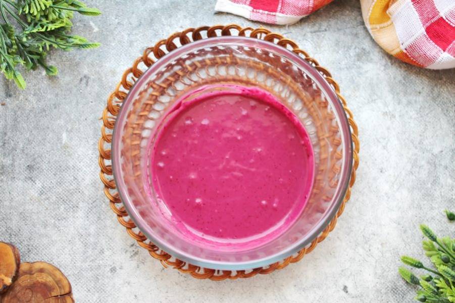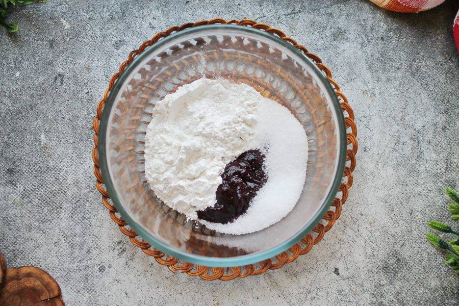 Для приготовления теста выложите в посуду рисовую муку, любой подсластитель и пюре из черной смородины.