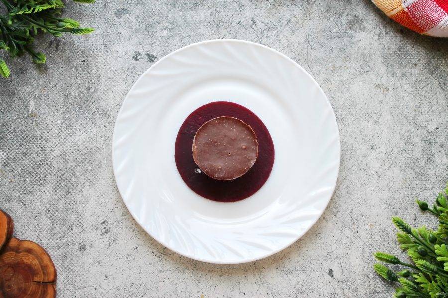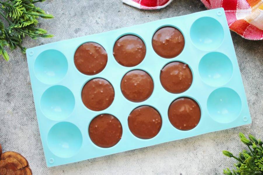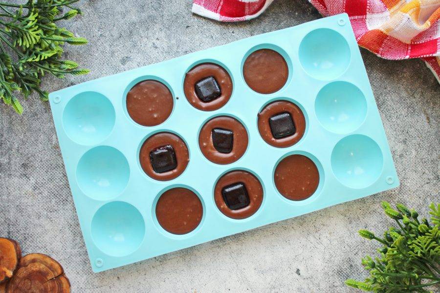 Разложите шоколадную массу в силиконовую форму с круглыми ячейками диаметром 5-6 сантиметров на 2/3 высоты. Выложите в середину замороженную начинку из черной смородины.
