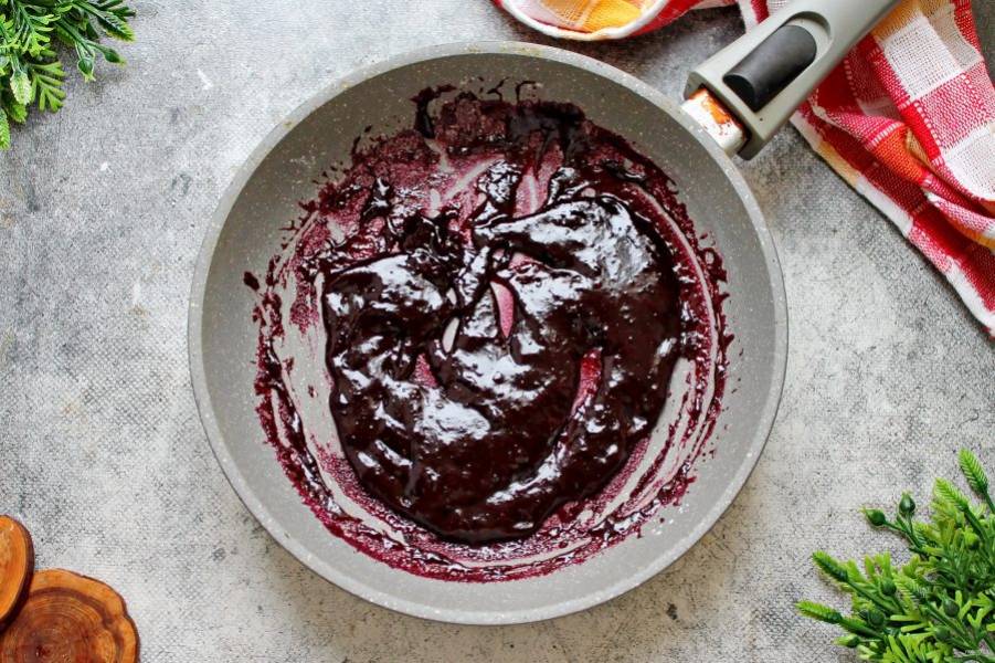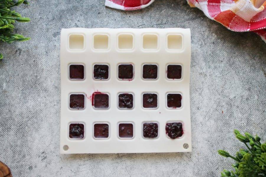 Для начала подготовьте центральную начинку. Для этого пюре из черной смородины выложите в кастрюлю с толстым дном и нагрейте на медленном огне до температуры 30-40 градусов. Смешайте пектин с сахарозаменителем и дождиком всыпьте в кастрюлю, перемешивая. Доведите все до кипения и варите в течение 10 секунд, перемешивая. Добавьте лимонную кислоту, перемешайте и снимите с огня. Разлейте массу в силиконовую форму с ячейками 2.5-3 сантиметра в диаметре. Дайте остыть и уберите в морозильную камеру, пока не замерзнут. На это уйдет примерно 1.5 часа.