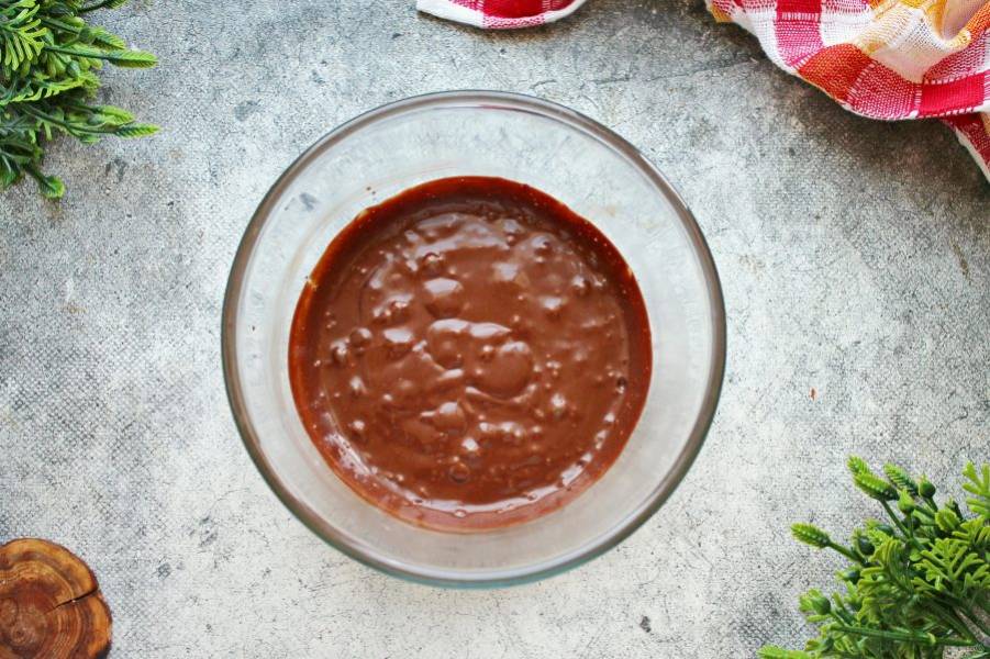 Желатин распустите на водяной бане. Шоколадную массу остудите и влейте желатин, перемешайте. Взбейте все блендером до однородной и более воздушной массы.