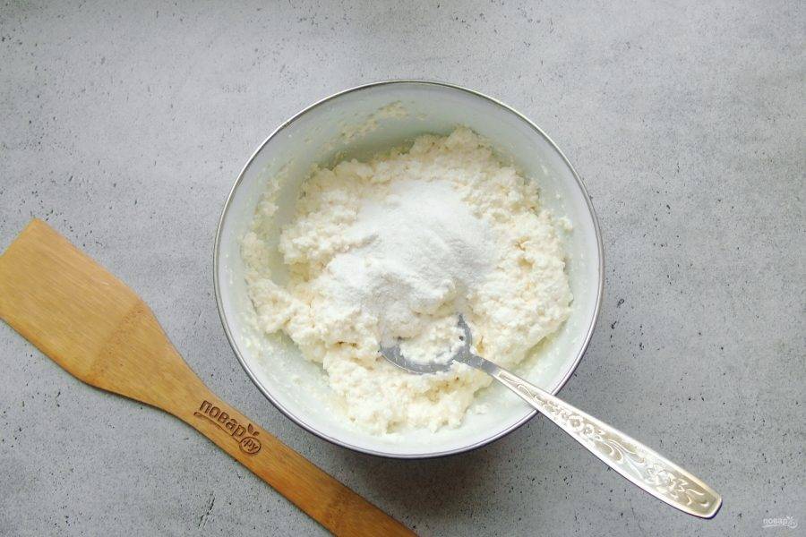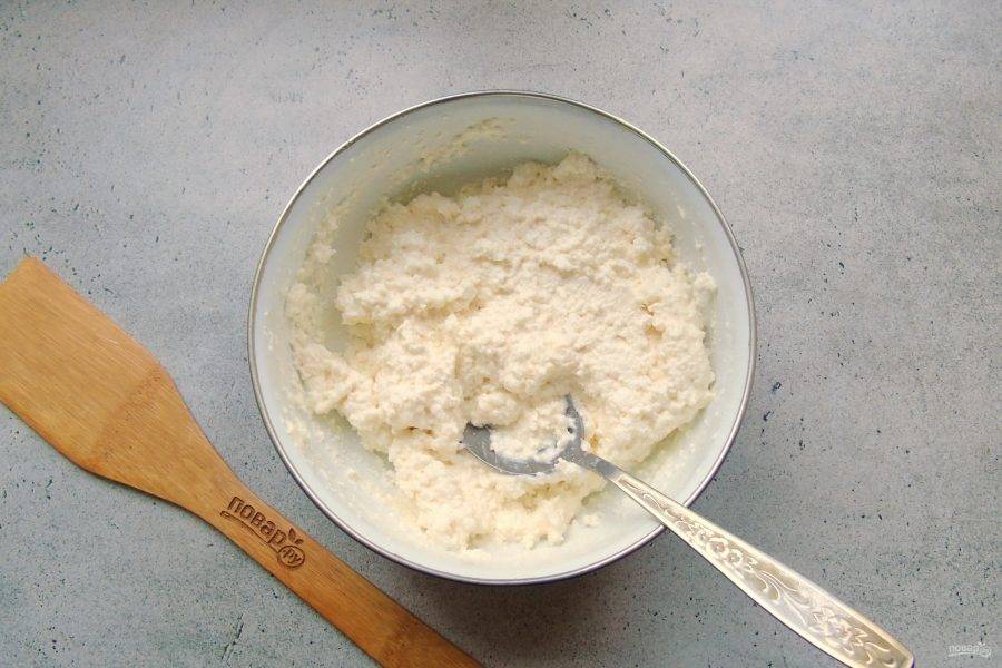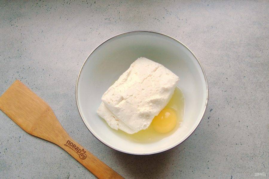 Добавьте щепотку соли и перемешайте с творогом и яйцом.