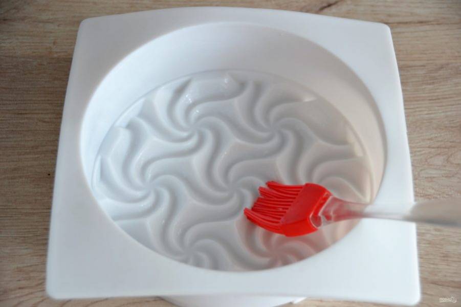 Подготовьте силиконовую форму диаметром 16 см., слегка смазав ее рафинированным растительным маслом.