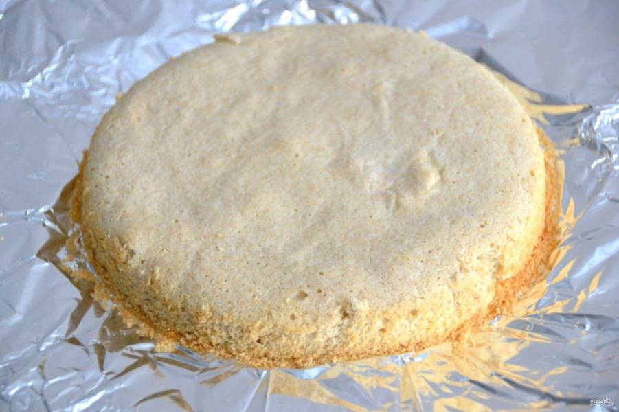 Аккуратно снимите с фольги готовый бисквит, перенесите его на тарелку.
