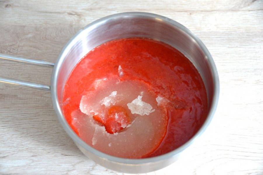 Слегка нагрейте ягодное пюре, добавьте в него желатиновую массу. Размешайте до полного растворения. Как только желатин растворится, сразу снимите с огня. Можно нагреть желатин в микроволновой печи и влить в ягодное пюре.