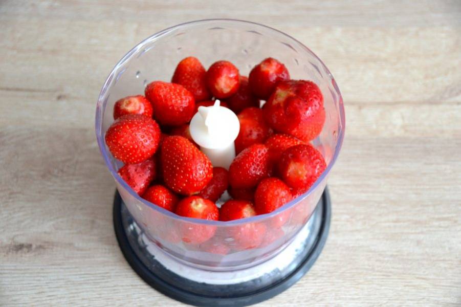 Первым делом займитесь приготовлением ягодного суфле. Для этого поместите ягоды в блендер.