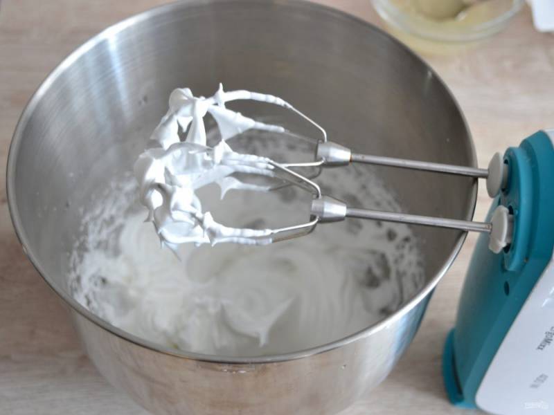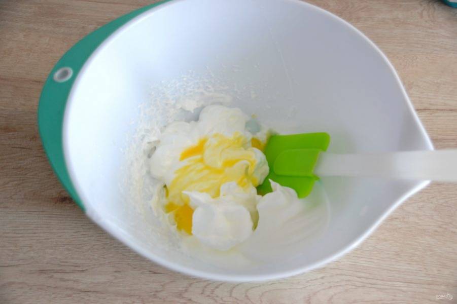 Добавьте к взбитым белкам желтковую массу, все перемешайте силиконовой лопаточкой движением снизу вверх, стараясь сохранить пышную структуру.