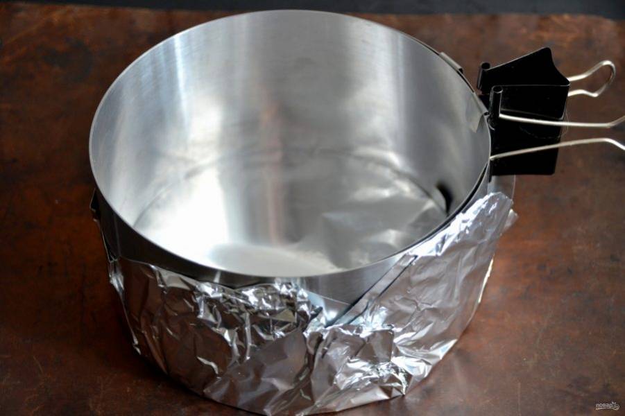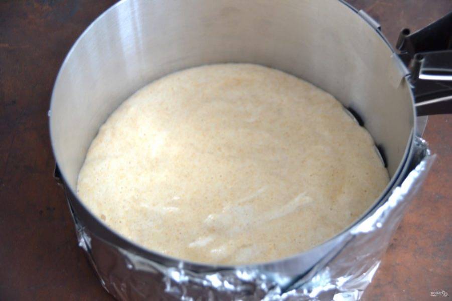 Для приготовления бисквита включите духовку на разогрев до 170 градусов. Подготовьте форму-кольцо диаметром 16 см., оберните его фольгой, поставьте сразу на противень.